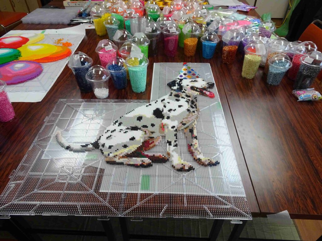 みんなで力をあわせて作ったアイロンビーズの完成品は、アゼリア館内で開催する『冬のアート展(1/9~2/22)』に展示する予定です。皆さんのご参加をお待ちしています。